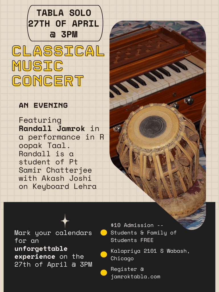 April & May Concerts 2025 Posted on April 6, 2025 by jamroktabla Go backYour message has been sent Name(required) Warning Email(required) Warning Attending?(required) Yes Warning Other Details Warning Warning. Send RSVPSubmitting form Δ Register on EventbriteShare this: Click to share on X (Opens in new window) X Click to share on Facebook (Opens in new window) Facebook Like Loading... Related